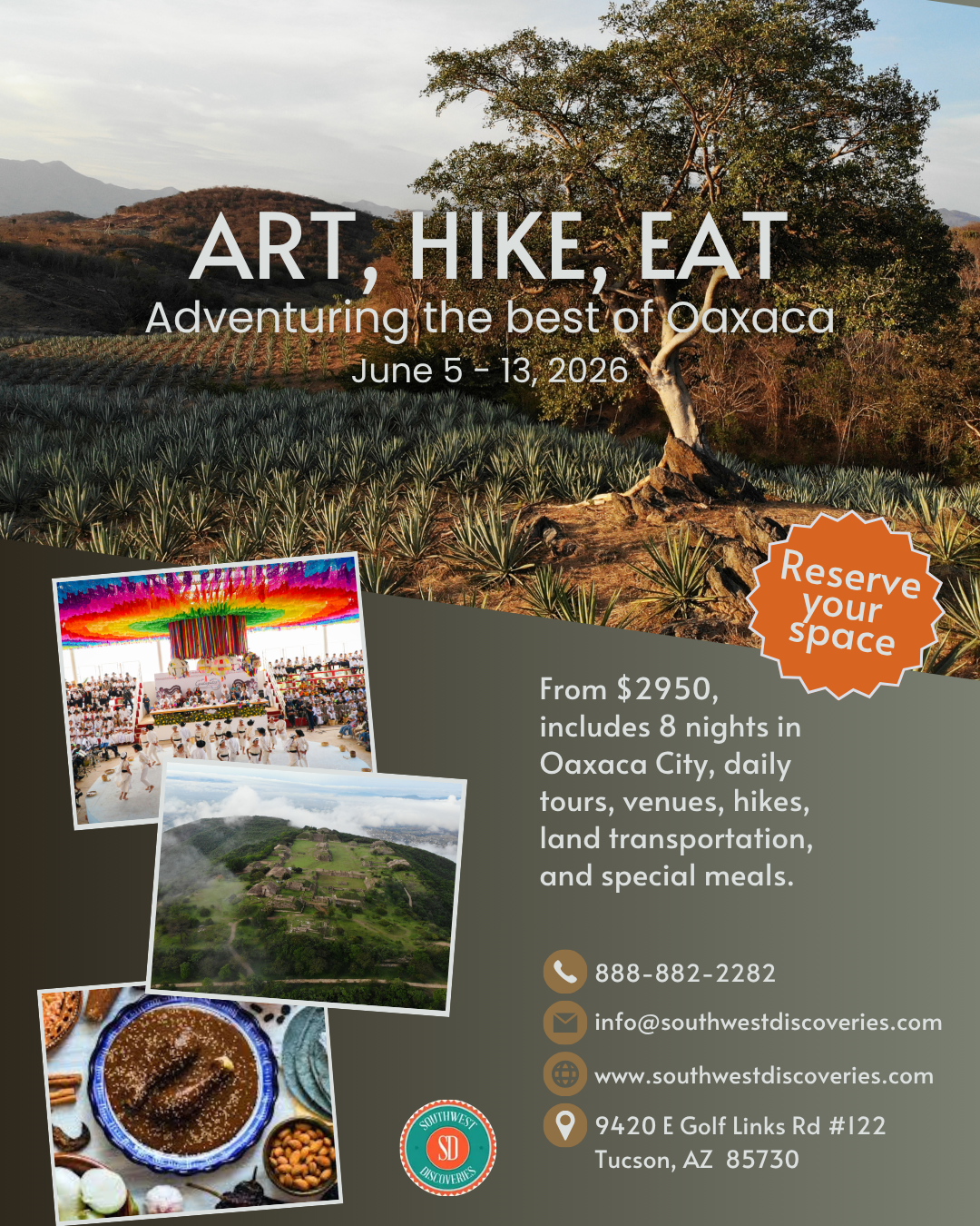 Trip price per person is $2950, includes 8 nights in a private room at a 4-star hotel in downtown Oaxaca, daily tours, all entrance fees, hikes and guides, land transportation, breakfasts, and lunch. Special price $2625 ($320 discount per person) for those sharing a king size room with two double beds. (Transportation to and from Oaxaca, as well as alcoholic beverages, are not included.)